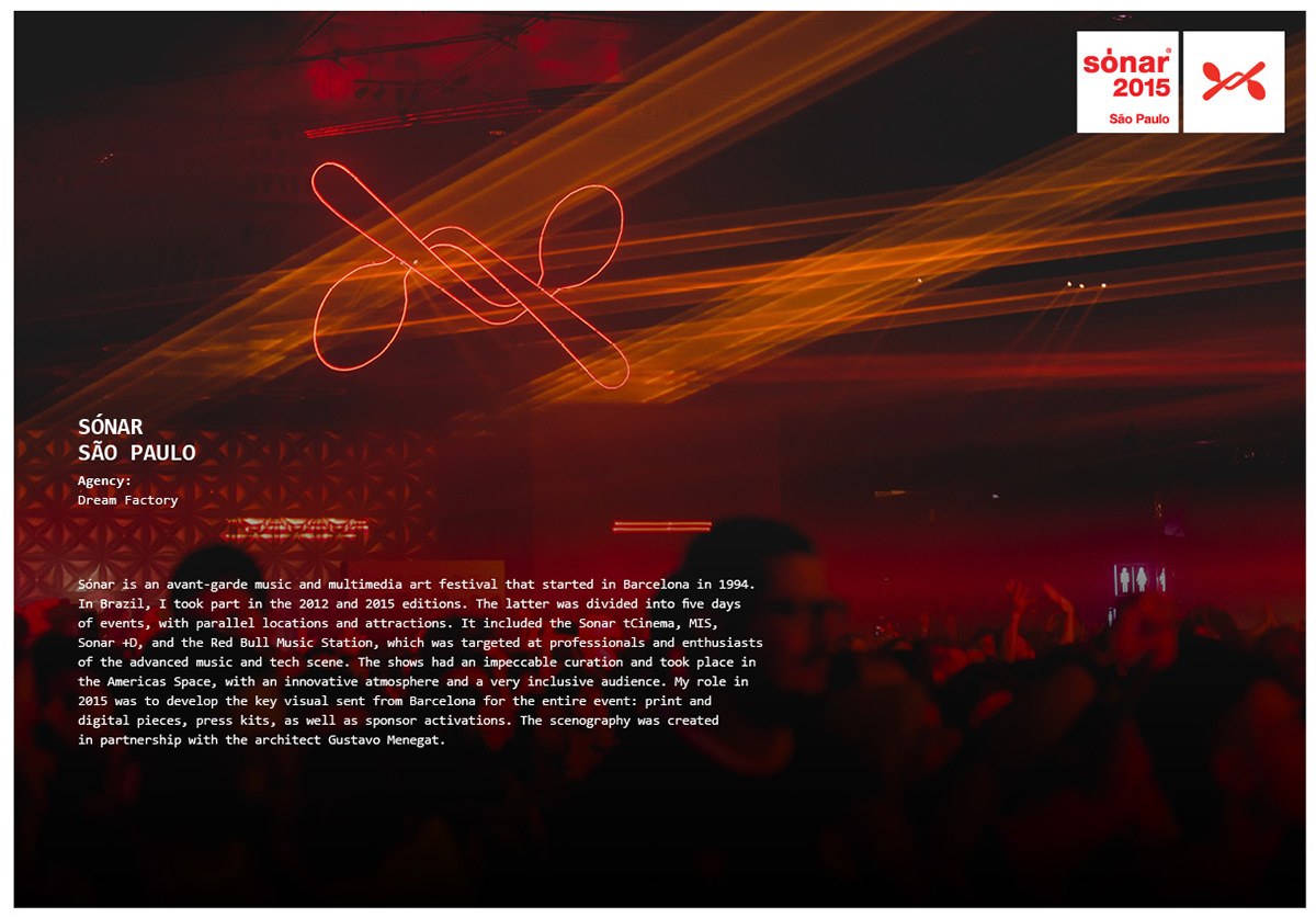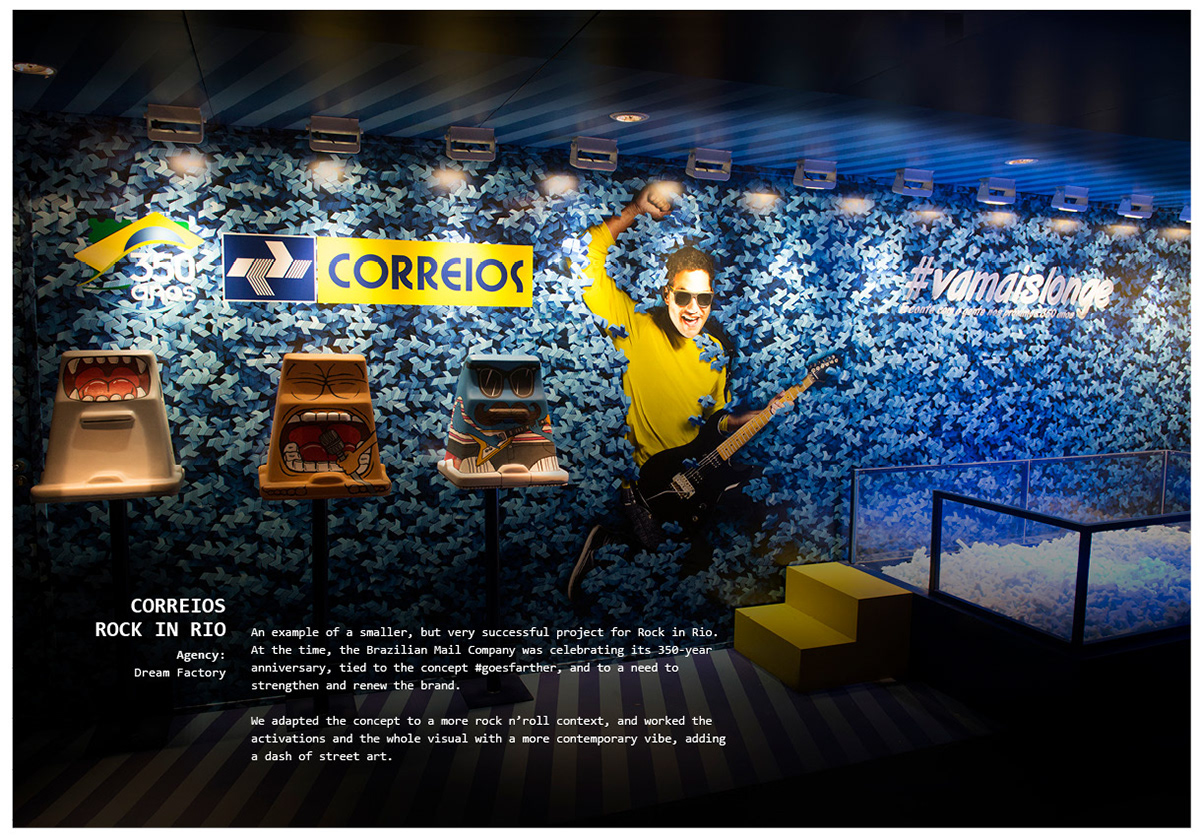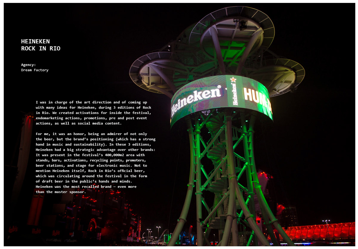 Here’s a board with some random projects of 3 editions of Rock in Rio. Looking at this after putting it together, I noticed a nice intersection among them — they all have a dash of irreverence and humor. In a general sense, this becomes an unconscious drive for me in many projects. Working with entertainment is a way I’ve found to take ideas, art and fun to a large number of people and to deliver a positive experience with a focus on audience engagement and client profitability.